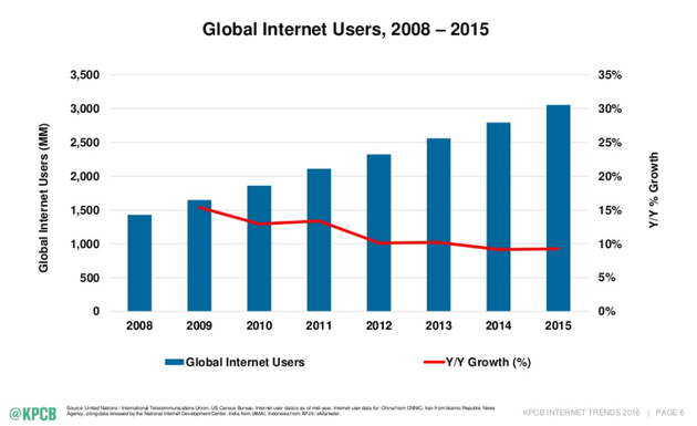 1、全球互聯(lián)網(wǎng)的滲透率比去年增長了9%,最終達(dá)到30億用戶或者42%全球人口的天花板(也不知道這個42%是怎么算出來的。)