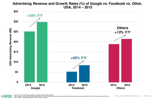 5、谷歌和Facebook聯(lián)手吃掉了美國76%的網(wǎng)絡(luò)廣告市場份額,盡管傳統(tǒng)媒體式微,受眾已經(jīng)轉(zhuǎn)移,但廣告主投到傳統(tǒng)媒體上的錢還是比新媒體要多。