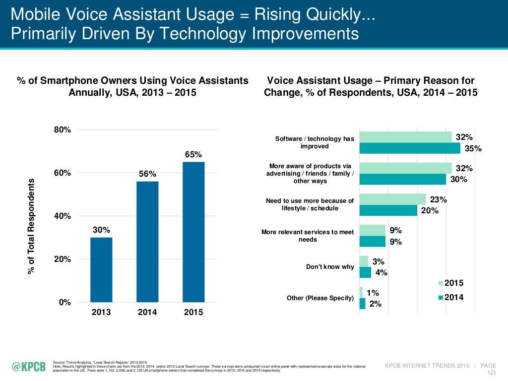 6、語音借口會成為下一個快速增長的市場,主要原因是快速,易操作、個人化以及無需用手,安卓的Google Now現(xiàn)在大約有20%的搜索來自語音,在iPhone出貨量增長停滯時,Amazon Echo(語音智能音響)出貨量快速增長。