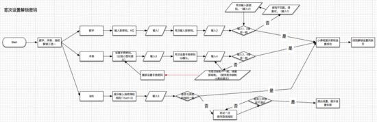 三種方式的設置流程不一樣。數(shù)字密碼在確認環(huán)節(jié)錯誤后,進入重新輸入密碼的環(huán)節(jié)。也就是說第一次輸入的數(shù)字已經(jīng)失效了。手勢密碼始終是驗證后面輸入的手勢是否與第一次輸入的一致,并且會有一個小圖標提示用戶繪制過的圖案。如果實在想不起來可以選擇重設手勢密碼。指紋密碼始終驗證系統(tǒng)指紋。具體流程如下圖