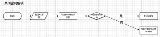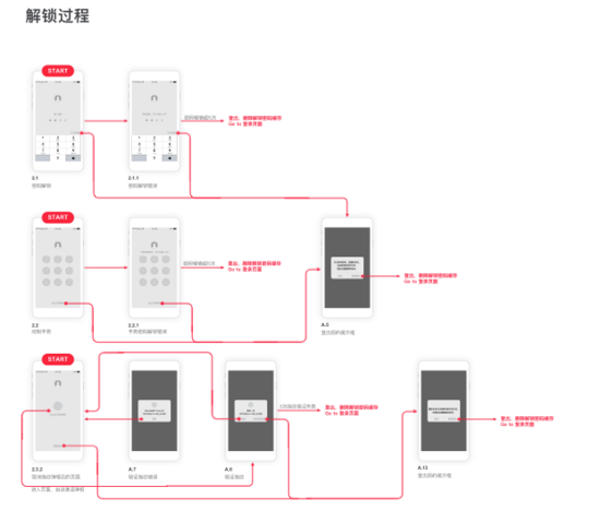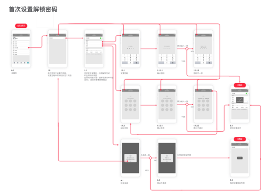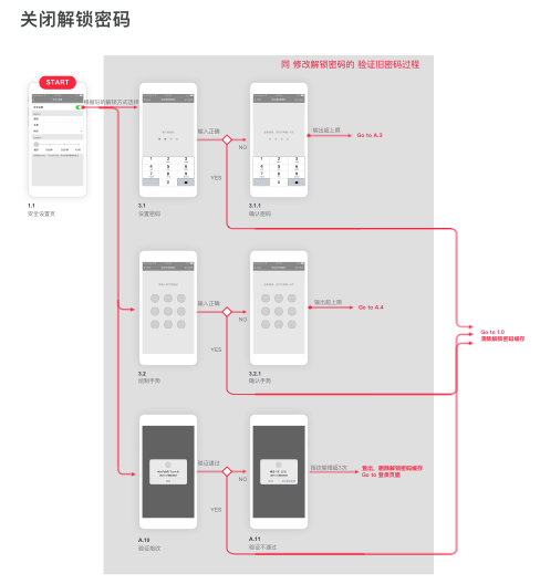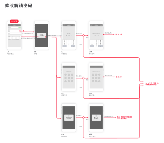修改第一步是驗證舊密碼,因為可以設置解鎖密碼出現(xiàn)的間隔,如果用戶設置的間隔時間過長,不驗證的話,安全風險比較高。這里畫的時候偷懶了,導致后面畫user flow的時候麻煩了些。