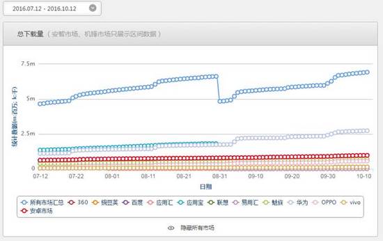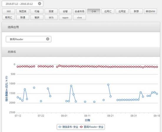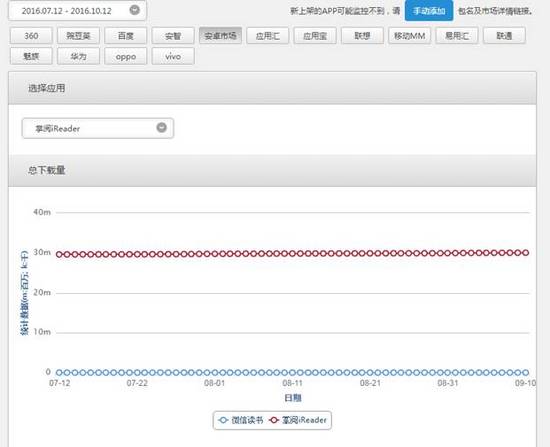 通過(guò)使用酷傳的應(yīng)用監(jiān)控可以看到,微信讀書(shū)在2016.7~2016.10這三個(gè)月,在各大市場(chǎng)的下載量一直增加,在8月下旬,總下載量有降低,但到8月底,下載量又開(kāi)始上升。整體而言,下載量一直在持續(xù)增加,目前下載量已近千萬(wàn),后面還會(huì)持續(xù)發(fā)力。
