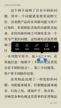 在閱讀過(guò)程中,可以長(zhǎng)按復(fù)制內(nèi)容,劃線,寫(xiě)想法,查字典等,但是和其他閱讀app(掌閱iReader,QQ閱讀,多看閱讀)有區(qū)別的是,微信讀書(shū)有分享功能,可以將自己認(rèn)為有價(jià)值的內(nèi)容分享到想法圈或制作成書(shū)簽圖片分享到微信,QQ,微博等其他社交圈子。