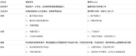 微信讀書(shū)是基于微信關(guān)系鏈的官方閱讀應(yīng)用,同時(shí)支持iOS和Android兩大終端平臺(tái)。和其他閱讀app有所不同的是,微信讀書(shū)有社交元素,正正應(yīng)了其官方宣傳語(yǔ),微信讀書(shū)—讓閱讀不再孤獨(dú)。我們可以看市場(chǎng)上比較熱門(mén)的掌閱iReader,重在閱讀范圍的廣而全,以及為用戶提供極致的用戶體驗(yàn),仿紙質(zhì)版讀書(shū),讓用戶在閱讀的過(guò)程中享受舒適。微信讀書(shū)另辟蹊徑,充分利用微信朋友圈的強(qiáng)大資源,走差異化路線,將閱讀+社交巧妙結(jié)合,迅速抓住用戶眼睛。