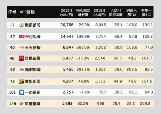 看了一下最近在中國比較火爆的數(shù)據(jù)機(jī)構(gòu)QuestMobile的數(shù)據(jù),基本也印證了我上述判斷。QM 數(shù)據(jù)顯示,9月 中國資訊App排名為:騰訊新聞、今日頭條、天天快報(bào)、網(wǎng)易新聞、新浪新聞、搜狐新聞、一點(diǎn)資訊和鳳凰新聞。分別對(duì)應(yīng)到五大門戶的新聞App和三大個(gè)性化資訊平臺(tái),而垂直類新聞App因?yàn)閷儆陂L(zhǎng)尾需求,沒有出現(xiàn)在榜單上。再看App Store 中國新聞App榜單,排在前面的基本也是這些應(yīng)用,與QuestMobile的數(shù)據(jù)互為印證。